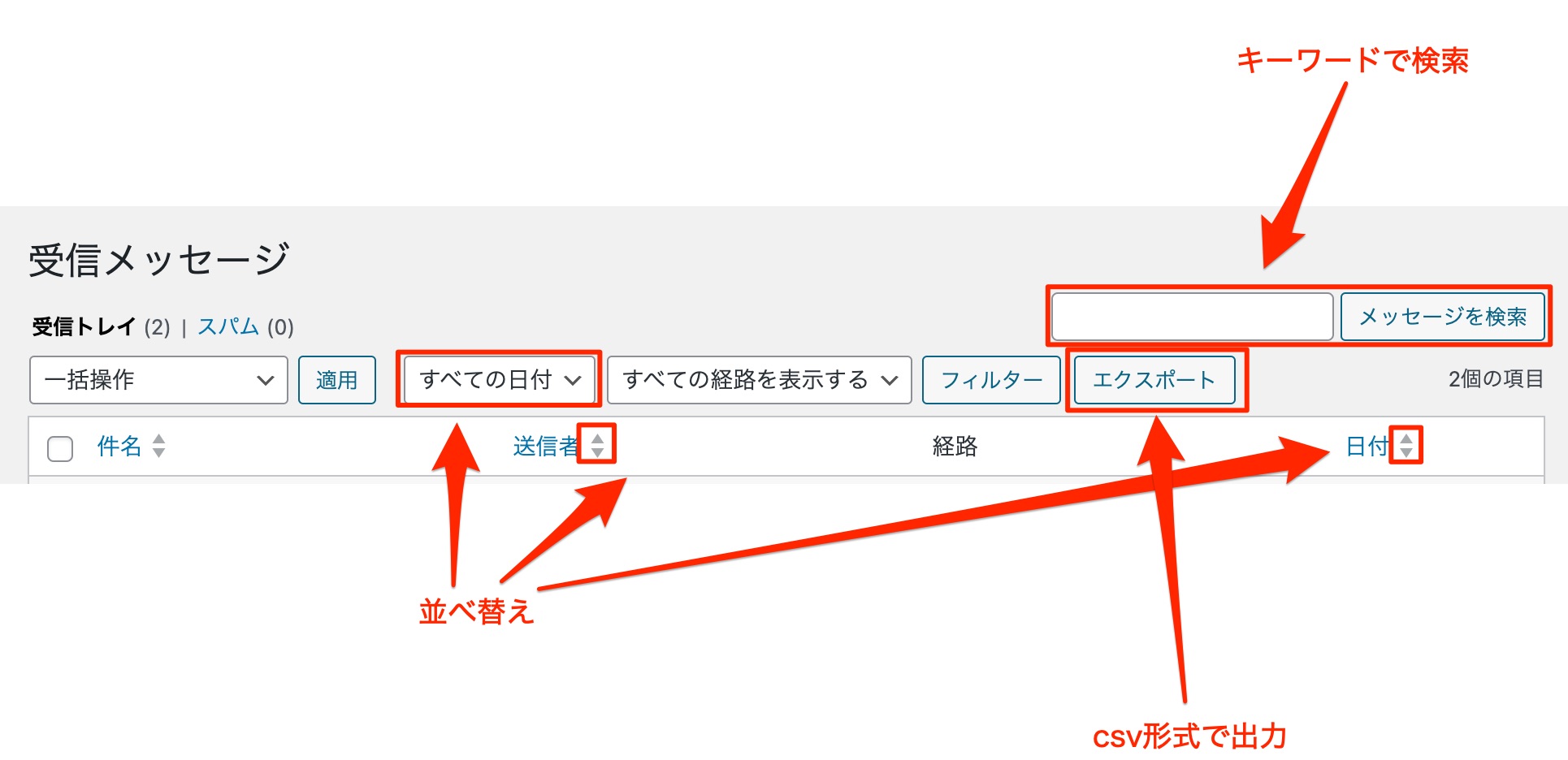 運営管理画面から【お問い合わせ管理】>【受信メッセージ】をクリックするとお問い合わせの受信メッセージ一覧が表示されます。