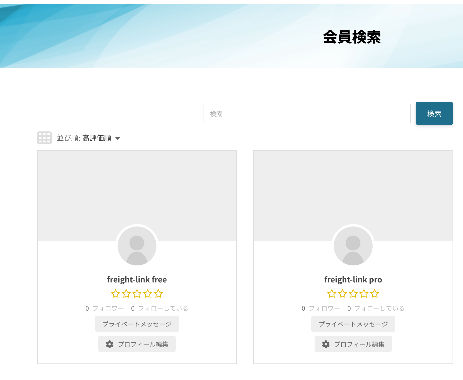 このページで、キーワードによる会員検索がができ、一覧表示はグリッド表示とリスト表示を切り替えることができます。