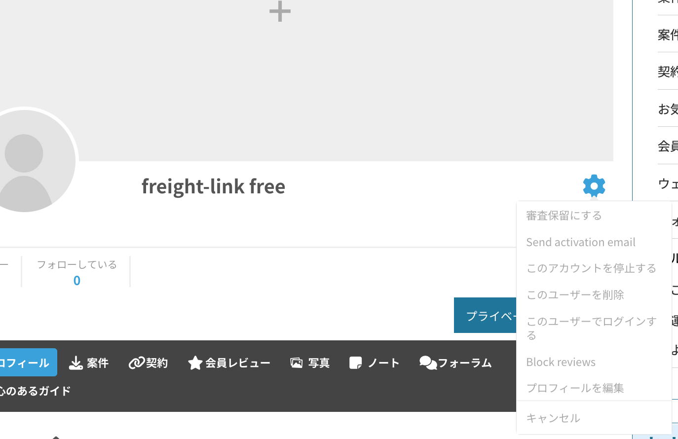 会員詳細ページでギアアイコンをクリックすると、そのユーザーに対するアカウント操作のメニューが開きます。